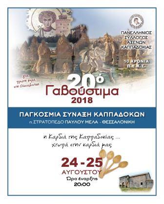 Περισσότεροι από 1.100 χορευτές με σαλβάρια, ζωνάρια, φέσια και γιλέκα και χορεύτριες με κεφαλόδεσμο γεμενιά και φλουριά, όλοι όμως ομοιόμορφα -ντυμένοι άλλοι με υφαντές και άλλοι με κεντητές -μακριές και σταυρωτές Βυζαντινότροπες Καππαδοκικές φορεσιές, έρχονται από όλο τον κόσμο στη Θεσσαλονίκη, για να δώσουν το έναυσμα του πιο δυνατού και του πιο ενωτικού – παγκόσμιου -επετειακού- εορτασμού – του Καππαδοκικού Ελληνισμού την Παρασκευή 24 και το Σάββατο 25 Αυγούστου 2018 στο στρατόπεδο Παύλου Μελά, συμμετέχοντας στο 20ΟΓαβούστιμα, με ώρα έναρξης στις 8 το βράδυ.
