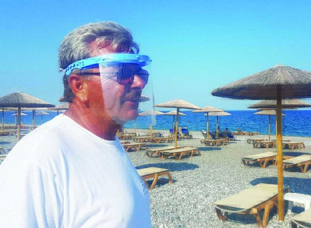 Στο ίδιο μήκος κύματος και ο Ηλίας, που επιβλέπει την τάξη και την τήρηση των υγειονομικών πρωτοκόλλων στην παραλία μπροστά από τη μονάδα. Τον συναντήσαμε στο σχόλασμα, το απόγευμα της Δευτέρας, αλλά και στην εκκίνηση της δουλειάς του, στο ξημέρωμα της Τρίτης. Και τις δυο φορές φορούσε τη διάφανη ασπίδα στο πρόσωπο και γάντια στα χέρια. «Στην παραλία έρχονται περισσότερο Γερμανοί, Ελβετοί και Ιταλοί. Καμιά φορά τους βλέπω που παρατηρούν τους διπλανούς τους, θέλουν να είναι σίγουροι για τις αποστάσεις. Αυτοί οι λαοί είναι πολύ προσεκτικοί με τα μέτρα».