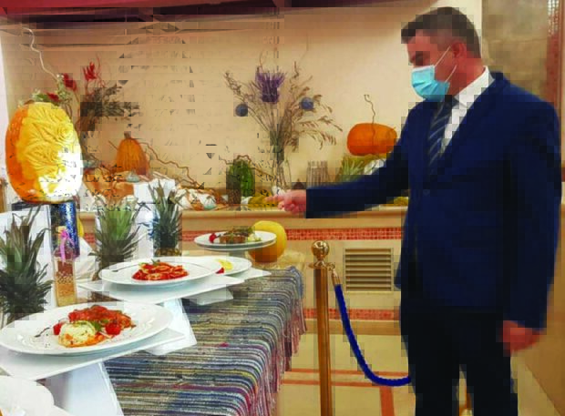 «Κάθε μέρα ετοιμάζονται 1000 τέτοιες συσκευασίες ώστε οι επισκέπτες μας να αισθάνονται απόλυτα ασφαλείς», δήλωσε ο Δημήτρης, μαιτρ του Atrium Palace. Ο ίδιος μας ξενάγησε στις δεκάδες επιλογές εδεσμάτων που προσφέρονται απλόχερα για το πρωινό, το μεσημεριανό και το βραδινό. Είναι ατελείωτη η λίστα όλων εκείνων που μπορούν να γραφτούν για τα πιάτα, όμως παραβλέπονται για την οικονομία του ρεπορτάζ. Ωστόσο, πρέπει να σημειωθεί ότι συνολικά μετρήθηκαν 12 άτομα προσωπικό που εργάζεται μπροστά και πίσω από το μπουφέ ώστε οι περίπου 350 επισκέπτες να εξυπηρετηθούν γρήγορα, χωρίς ουρές και χωρίς παράπονα.