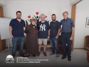 Την Παρασκευή 2 Ιουλίου, κλιμάκιο της νεοεκλεγείσας ΝΕ επιτροπής, ΠΑΣΟΚ -ΚΙΝΗΜΑ ΑΛΛΑΓΗΣ, Α΄ Θεσσαλονίκης, συναντήθηκε με τον Διευθυντή της Θεραπευτικής Κοινότητας ΚΕΘΕΑ ΙΘΑΚΗ, κο Φαίδωνα Καλοτεράκη, στο πλαίσιο μιας σειράς προγραμματισμένων δράσεων, ενημερωτικών επισκέψεων, σε όλα τα δημόσια Θεραπευτικά Προγράμματα κατά των Εξαρτήσεων ΟΚΑΝΑ, ΚΕΘΕΑ, ΨΝΘ),που δραστηριοποιούνται στην πόλη.
