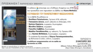 Οι εκδόσεις Επίκεντρο και ο Σύλλογος Αποφοίτων του ΑΠΘ, διοργανώνουν την Παρασκευή 20 Ιανουαρίου, στις 6.30 μ.μ, στην Αίθουσα Τελετών της Φιλοσοφικής Σχολής ΑΠΘ (Κτίριο Παλαιάς Φιλοσοφικής), εκδήλωση παρουσίασης του βιβλίου του Κώστα Δ. Μπλιάτκα «Η συνείδηση του Πανεπιστημίου Θεσσαλονίκης»