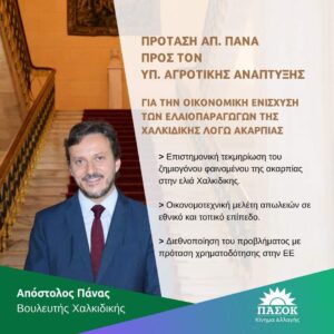«ΠΡΟΤΑΣΗ ΑΠ.ΠΑΝΑ ΠΡΟΣ ΤΟΝ ΥΠΟΥΡΓΟ ΑΓΡΟΤΙΚΗΣ ΑΝΑΠΤΥΞΗΣ & ΤΡΟΦΙΜΩΝ ΓΙΑ ΤΗΝΟΙΚΟΝΟΜΙΚΗ ΕΝΙΣΧΥΣΗ ΤΩΝ ΕΛΑΙΟΠΑΡΑΓΩΓΩΝ ΤΗΣ ΧΑΛΚΙΔΙΚΗΣ ΛΟΓΩ ΑΚΑΡΠΙΑΣ»