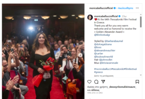 Τιμήθηκε για την προσφορά της στην 7η Τέχνη από το… LADY’S LAND Μόνικα Μπελούτση: Τιμήθηκε για την προσφορά της στην 7η Τέχνη από το 64 ΦΚΘ – Η ανάρτηση της μετά το βραβείο από το Φεστιβάλ Θεσσαλονίκης Κυριακή, 12 Νοεμβρίου 2023 20:36 Η εκθαμβωτική Μόνικα Μπελούτσι, επίσημη προσκεκλημένη του 64ου Φεστιβάλ Κινηματογράφου Θεσσαλονίκης, παρέδωσε συνέντευξη Τύπου, στην αίθουσα Τζον Κασσαβέτης, λίγες ώρες πριν την ειδική προβολή της ταινίας Μαλένα στο Ολύμπιον, όπου της απονεμήθηκε ο τιμητικός Χρυσός Αλέξανδρος.
