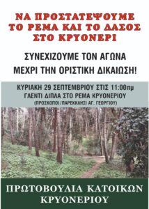 Σε μια περίοδο όπου κυριαρχεί το αίσθημα της ηττοπάθειας και της απογοήτευσης, οι κάτοικοι του Κρυονερίου θέλουμε να μεταφέρουμε ένα αισιόδοξο μήνυμα, οι αγώνες μας μπορούν να φέρουν επιτυχίες, αρκεί να είναι καλά οργανωμένοι και να έχουν διάρκεια, μαχητικότητα και μαζικότητα.