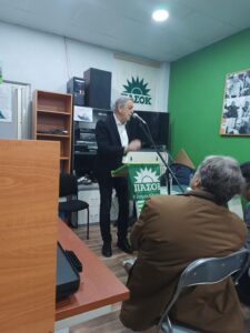 Αρχικά την εκδήλωση χαιρέτησε ο υπεύθυνος της νομαρχιακής και αντιδήμαρχος Γεώργιος Αρβανίτης συνέχεια γραμματέας της νομαρχικής επιτροπής και ακολούθησε η ομιλία του Πάρη Κουκουλόπουλο