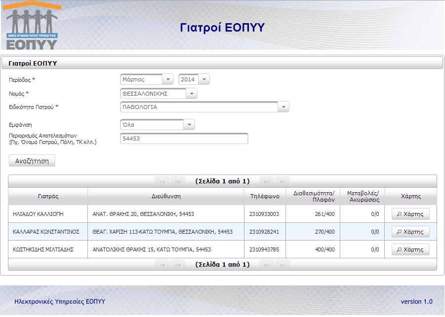 Ακολουθεί παράδειγμα: Τρέχον Μήνας Μάρτιος 2014, Νομός Θεσσαλονίκης, Περιοχή: Κάτω Τούμπα, Ειδικότητα Γιατρού: ΠΑΘΟΛΟΓΙΑ.